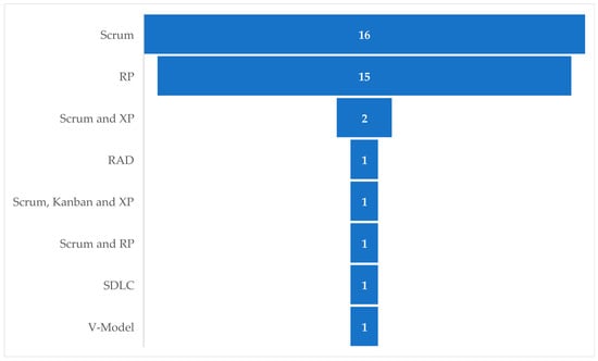 As can be seen in Figure 4, most of these IoTSs have been developed using the Scrum methodology [60,116,120,136,137,138,139,140,141,142,143,144,145,146,147,148], specifically in 42.11% of the IoTSs considered, with RP [149,150,151,152,153,154,155,156,157,158,159,160,161,162,163] being the other most used methodology, with 39.47%. In addition, Scrum has been used in combination with other methodologies in 10.53% of cases. So, for example, there are developments by combining Scrum with XP [57,58], or using a combination of Scrum, XP, and Kanban [164], or combining Scrum with RP [59]. The least used methodologies have been Rapid Application Development (RAD), V-Model [165], and SDLC (System Development Lifecycle) [166], representing 2.63% each, while Kanban has only been used for the development of IoTSs in combination with Scrum and XP.