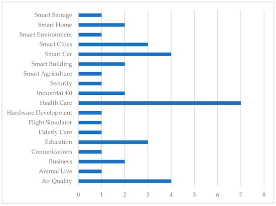 In the works represented in Figure 4, the areas or fields of application in which the IoTSs proposed them have been developed have also been identified. The results of this analysis can be seen in Figure 5, where it can be seen that the domain in which the development of IoTSs has been most formalised is Health Care, with 18.42%, followed by those of Smart Car and Air Quality, with 10.53% in each of them with respect to the total of the works considered for this analysis.