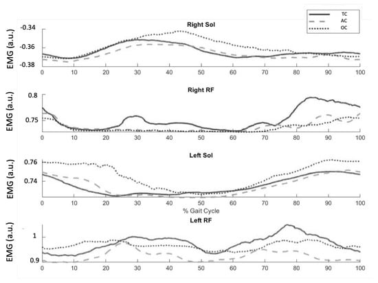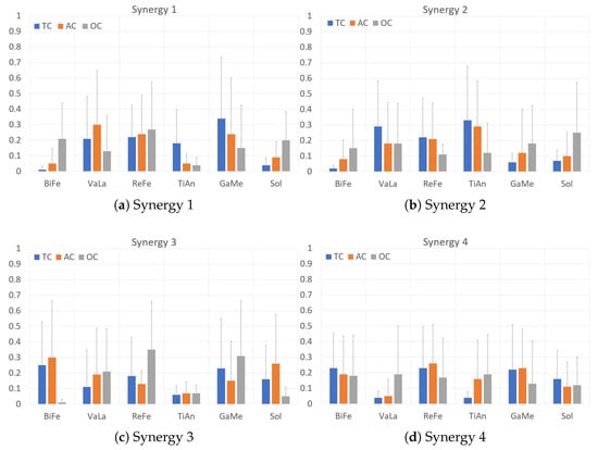 - Synergy 4 shows, for the TC walking condition, a noticeable ankle plantarflexion activity (GaMe and Sol muscles and a small TiAn contribution), whereas the knee shows an agonist–antagonist co-contraction (BiFe and ReFe muscles). Again, this activity remains with slight variations for the AC walking condition, whereas the OC walking condition shifts towards ankle dorsiflexion (increase in the TiAn contribution, decreasing in the GaMe and Sol muscles) with an increase in knee extension activity (VaLa muscle), although the contribution of the BiFe to co-contraction remains. Similarly, the average mean duration synergy 4 remains for the TC and AC walking conditions, showing a significant decrease for the OC walking condition (Table 4).