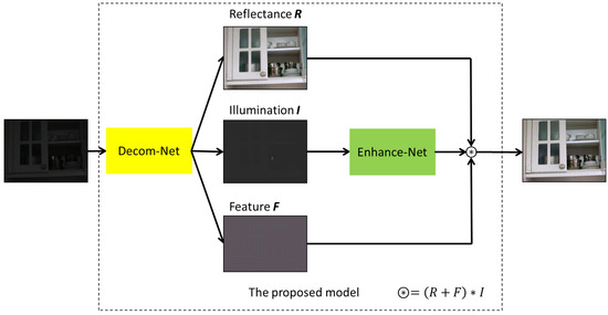 We decompose low-illumination image S into three parts: illumination map I, reflectance map R, and feature map F.