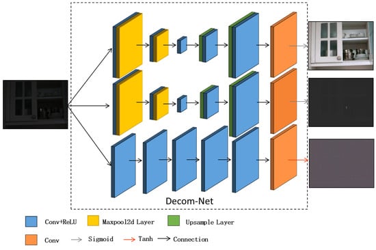 Our Decom-Net is inspired by the Retinex theory. However, the original RetinexNet proposed by Chen et al. [17] erases many detailed features of the image when noise reduction is applied to the image. In response, we propose a three-branch convolutional decomposition network, shown in Figure 2, with three branches for estimating the illumination map, the reflectance map, and the feature map, respectively. It features a pooling layer in the decomposition process, which allows the illumination and reflectance maps to be denoised during the decomposition process. The Sigmoid function is chosen for the activation functions of the illumination and reflectance maps to ensure that the output is between 0 and 1. The activation function for the feature map is chosen as the tanh function. The output of tanh is between −1 and 1, which has faster model convergence. The decomposition of the image is carried out when the number of iterations has been reached and the loss function has reached its minimum value.