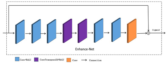 The main purpose of the Enhance-Net is to adjust the brightness of the illumination, as shown in Figure 3. The input of the module is the illumination map output by the Decom-Net. The module is composed of eight convolutional layers, which can effectively obtain the illumination information of the illumination map. In order to make up for the possible loss of the effective information of the illumination map during the process, the input layer is finally spliced to the last layer, and the output is the adjusted illumination map.