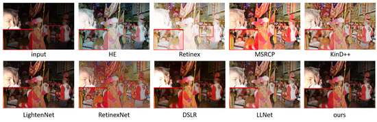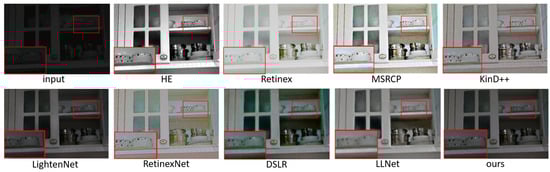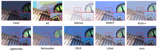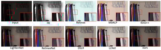 We show the enhancement effects of various algorithms in Figure 4, Figure 5, Figure 6 and Figure 7, and enlarge some of the details to better carry out subjective visual evaluation. Figure 4 and Figure 5 belong to the LOL dataset. In Figure 4, HE significantly improves the image brightness by pulling up the contrast, but the overall image distortion is serious. Retinex has the best visual brightness improvement effect in Figure 4, but the clothing color is distorted and obvious noise can be seen in the enlarged image. Compared with the previous two methods, ExCNet avoids the impact of color distortion, but the detail is lost severely and the image is white as a whole. RRDNet performed well on the original brighter images but performed relatively poorly on the darker images, where the brightness boost was not significant, making it difficult to achieve good visual effects. The LightenNet method showed average brightness improvement in the comparison method, but the image showed a white blocky phenomenon. Although Zero-DCE can retain the detail features of the image well, the brightness enhancement is not obvious, and the color contrast of the image is significantly reduced. The enhancement effect of DSLR produces obvious stacked block phenomenon, the whole wardrobe part appears as a block effect, and there are artifacts. For LLNet, it can be seen from the hanger and the enlarged part that details are seriously lost, and the image enhancement effect is blurred as a whole. Compared with other methods, the brightness improvement effect of the proposed method may not be the most ideal, but it effectively avoids other problems, such as color distortion, detail loss and artifact phenomenon, etc., and the brightness of the enhanced effect is improved as a whole without overexposure or underexposure phenomena. Figure 6 and Figure 7 are from the 5 K dataset. In Figure 6, the Retinex method has the highest visual brightness, but the overall image is overexposed and the visible details are seriously lost. The enhancement effect of the HE method is overall white. RRDNet, as with DSLR, has a low brightness boost, which has a big impact on visual effects.
