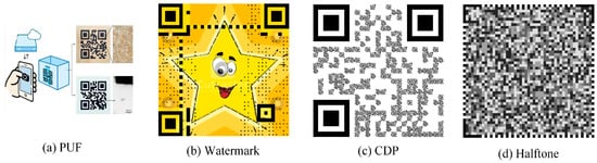 Different degrees of random toner adsorption occur in a digital graphic during printing, ensuring its physical non-replicability. The special design of the graphic can further amplify the distortion phenomenon, which can be identified by the algorithm. QR codes are widely used due to their strong coding ability and large information capacity. As QR codes are composed of a large number of black and white blocks, they are insensitive to the noise and distortion generated during printing. Therefore, the fusion of anti-counterfeiting graphics with QR codes is gaining increasing attention. At present, the fusion can be summarized as physical unclonable function (PUF) [16,17,18,19], watermark [20,21,22,23], copy detection pattern (CDP) [24,25,26,27,28], and halftone [29,30,31,32]. Although the above methods can achieve certain anti-counterfeiting effects, there are still some aspects that can be improved.