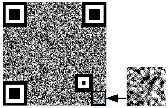 Figure 7 shows the combined anti-counterfeiting texture code and its details. The code points in the code data region are minor and nearly integrated into the anti-counterfeiting background. Since the position detection area is complete and the original QR code has a maximum error correction capability of 30%, the semantics of the anti-counterfeiting code can still be decoded by the code scanning device. The position detection area, calibration area, and black and white code points of the refined QR code are unchanged, while the rest of the code is replaced with Gaussian random texture patterns. The formula for this is as follows: