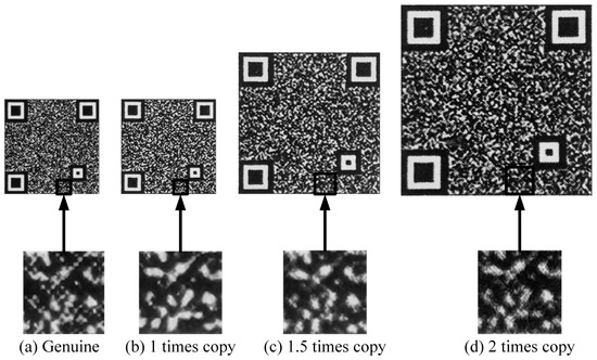 In the actual process of counterfeiting, the counterfeiters resort to superior-quality enlarged copies. On the one hand, consumers generally do not know the size of the code. The original size of the code is generally small, and a copy enlarged within two times will not make a particularly noticeable difference. On the other hand, product packaging includes not only a single outer package but also a boxed package. The use of enlarged anti-counterfeiting codes on the whole box packaging is not against the law and will deceive consumers. As shown in Figure 12, it can be seen that the texture details of the genuine code are rich, while the counterfeit code is glued and cannot be decoded by a code decoding device and can therefore be directly identified as a fake. The enlarged copies reconstruct texture details better than the equal copy, part of the codes can be decoded, and the first-level feature fails. Therefore, to ensure accuracy, it is also necessary to send the decoded code to the second-level detection, the DFT spectral feature.