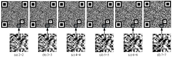 After selecting version number 3 and error correction level H to generate the original QR code, the modules of the QR code need to be refined to code points. The larger the code points, the more visual it is, the faster the decoding, and the smaller the area of the texture pattern. Thus, it is necessary to choose an appropriate code point size. Figure 15 shows anti-counterfeiting codes with different code points sizes of 2 × 2, 3 × 3, 4 × 4, 5 × 5, 6 × 6, and 7 × 7 and their enlarged details.