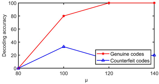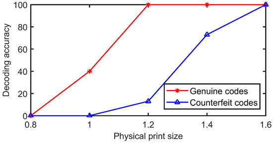Five genuine codes with code points sizes of 2 × 2, 3 × 3, 4 × 4, 5 × 5, 6 × 6, and 7 × 7 are generated, among which, the expectation of Gaussian distribution is selected as 120, the physical print size is 1.2 cm, and the pixel size is 580 × 580. After printing, the same printer is used for copying and enlarging to obtain 15 counterfeit codes, for a total of 30 genuine codes and 90 counterfeit codes in six groups. The decoding experiment is shown in Figure 16. It can be seen that when the pixel sizes of the code points are 2 × 2, 3 × 3, and 4 × 4, the genuine codes cannot be decoded 100%, so they cannot be applied to the anti-counterfeiting code. When the pixel sizes of the code points are 5 × 5, 6 × 6, and 7 × 7, all genuine codes can be fully decoded and the decoding rates of the fake codes are 13%, 53%, and 100%, respectively. Therefore, considering the comprehensive guarantee of the decoding robustness of genuine codes and the decoding fragility of counterfeit codes, the size of code points is selected as 5 × 5 pixels.
