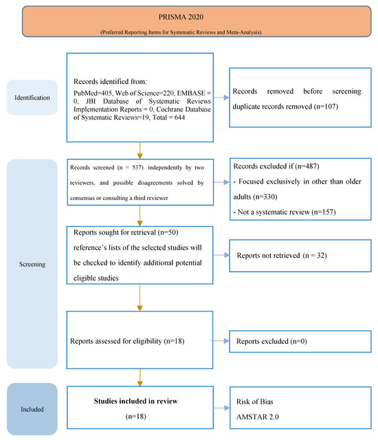The database search retrieved 644 records, seven of them were duplicates, which were eliminated. After the analysis of titles and abstracts, 487 studies were excluded because they were not systematic reviews (n = 157) or they exclusively analyzed groups other than older adults (n = 330). Accordingly, 18 systematic reviews were included in this umbrella review (Figure 1). Nine of the reviews were developed in European countries [17,18,19,20,21,22,23,24,25], four in North American countries [26,27,28,29], three in Australia [30,31,32], one in Pakistan [33], and one in India [34]. The number of studies included in each review varied between 7 and 73, with an average of 32 studies, and a median of 25 studies. A detailed description of the studies is shown in Table 1.