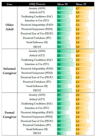 | UEQ Construct | Older Adults n. 5 | Informal Caregivers n. 4 | Formal Caregivers n. 2 |