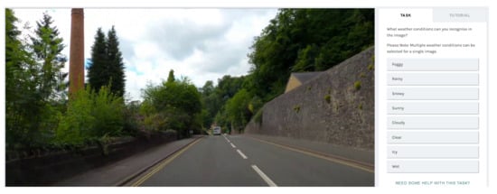 To annotate the images, we utilised an online annotation platform called Zooniverse [25]. In Zooniverse, volunteers assist researchers in data annotation and pattern recognition tasks. We created a project in Zooniverse for annotating the images, uploaded the images, specified the labels, and added volunteers to our project. Zooniverse provides an easy-to-use interface for annotating the images, as shown in Figure 4. As shown in the figure, each image could be assigned to more than one weather condition. The annotations were carried out by two volunteers. After annotating the images, Zooniverse offers an option to export the annotations to a comma-separated values file. Table 2 shows the distribution of the images in different weather conditions. The dataset is imbalanced with the majority of the images classified as clear and sunny, while icy is the least classified as UK roads are rarely icy. Six sample images from the dataset are shown in Figure 5, and the complete dataset is available online at [26].