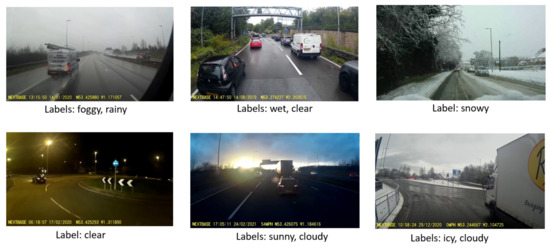 Due to a lack of a publicly available multi-label road weather dataset, we have created an open-source dataset consisting of road images depicting eight classes of weather and road surface conditions, i.e., sunny, cloudy, foggy, rainy, wet, clear, snowy and icy. The images are extracted from available online videos on YouTube captured and uploaded by ‘Alan Z1000sx’ (the YouTube account that owns the road-facing videos) using a video camera mounted on the dashboard of a heavy goods vehicle completing journeys across the UK (a sample video is available at [24]). The video clips captured different roads in the UK (i.e., motorways, urban roads, rural roads, and undivided highways), different weather conditions (i.e., sunny, cloudy, foggy, rainy, wet, clear, snowy and icy) and different lighting conditions (i.e., sunset, sunrise, morning, afternoon, night, and evening). We downloaded 25 videos uploaded by ‘Alan Z1000sx’ with an average duration of 8 min. We developed a python script to extract images from the videos every 10 s. A total of 2,498 images were extracted.