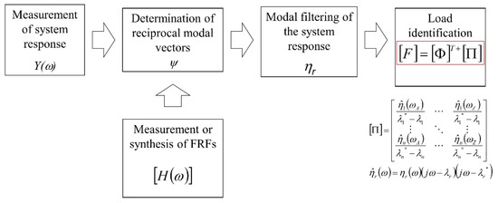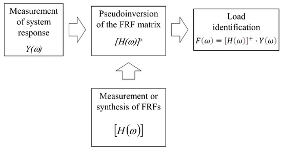 The FRF matrix [H(ω)] is not square with a size of (n × m), and it cannot simply be inverted. Therefore, a pseudo-inversion algorithm should be used in the form of Singular Value Decomposition (SVD) or the Moore–Penrose method. Sometimes the FRF matrix is unavailable. In such a case, it can be synthesized based on an FE model [3] or a modal model [22] of the object. The block diagram of the method is shown in Figure 1.