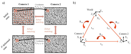 The 3D-DIC version employs stereovision and triangulation to retrieve 3D displacements from the image sequences of two cameras. For this purpose, an additional correlation is required in the first step to match the subsets of the reference image of both cameras, as shown in Figure 3a. Triangulation is then performed to determine the 3D coordinates of each subset according to the following parameters of the stereo system obtained in the calibration procedure: intrinsic (related to the lens and the camera) and extrinsic (transformations between the camera coordinate systems and the world system) parameters, as illustrated in Figure 3b).