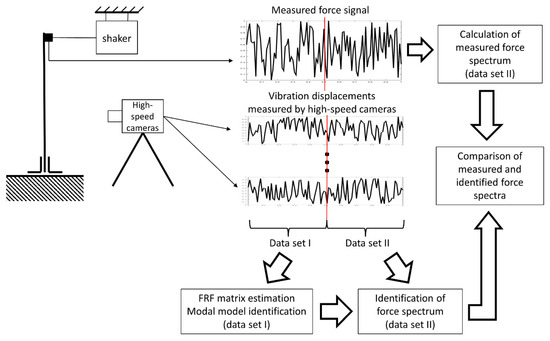 The excitation force spectrum was identified in the next step, based on the responses from the second data sequence, and compared with the measured force spectrum. The procedure is shown in Figure 6. As a measure of the quality of identification, the value of Pearson’s correlation coefficient between both spectra and the average value of signal spectrum magnitude were assumed.