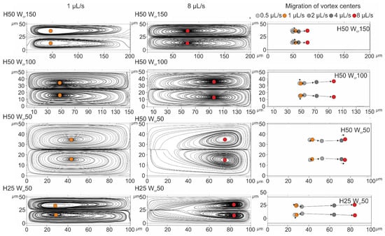 The formation of Dean vortices and the movement of their center position were simulated in COMSOL Multiphysics as presented in Figure 2. The height of the obtained curved channels was considered as 50 µm; their critical width altered between 150, 100, and 50 µm; and the flow behaviors were compared to the cases characterized with the channel parameterized by the height of 25 µm and critical width of 50 µm (H25_Wcr50), in which the best lateral separation of 4.8 and 15.8 µm beads was achieved at 0.5 µL/s flow rate [1]. Although in the case of the smaller channel cross-section (H25_Wcr50), 2 µL/s was the maximal experimental flow rate (to prevent leakage and channel deterioration), the simulations were implemented in even higher flow rates of 0.5, 1, 2, 4, 8 µL/s, respectively.