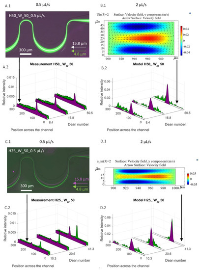 In the case of the structure denoted by H50_Wcr50, the larger beads (Ø 15.8 µm) were already laterally focused at 0.5 µL/s flow rate; however, the smaller ones (Ø 4.8 µm) could not be at even higher flow rates. In our previous experimental work, the flow rate was altered between 0.5 and 6 µL/s in this specific structure. In this flow rate range, the trajectory band of the 4.8 µm size beads narrowed until 3 µL/s, but above that, it started to broaden again. This phenomenon is in good accordance with the simulated results (see the lateral distributions in Figure 3A) and could be explained by the mixing effect of the evolving Dean vortices.
