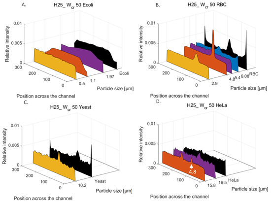 Experimentally determined lateral distributions of the studied biological cells and their model beads developed in the periodically inhomogeneous curvilinear-focusing microfluidic channel in H25_Wcr50 at 1 µL/s flow rate: (A) for E. coli with polystyrene beads of Ø 0.5, 1.1 and 1.97 µm; (B) for Red blood cells (RBC) with beads of Ø 2.9, 4.8, 5.4 and 6.08 µm; (C) Saccharomyces cerevisiae (Yeast) with bead of Ø 10.2 µm; (D) HeLa cells with polystyrene beads of Ø 4.8, 15.8 and 16.5 µm.