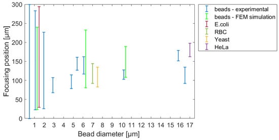 To validate the reliability of the FEM simulation, a probable focusing range in the cross-section of the channel was defined and compared to the measured focusing positions in the case of bead diameters of 1.1 µm, 6.8 µm, and 10.2 µm, respectively. The modelled probable focusing ranges are also indicated in Figure 7. The central positions of the modelled particle distribution were in accordance with the experimental case. The modelled spread of the particles—variation in the numerical simulation—was higher due to the limited number (1000) of the test particles.
