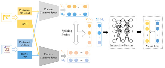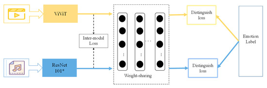 As two different modalities, video and music have a large heterogeneity of data. Video often contains a mix of content information such as actions, objects and scenes. In contrast, music, as a kind of audio with lyrical characteristics, contains more emotional information. Based on this heterogeneity, it is effective to take emotional information into account in video–music retrieval. There is a broad base of research on emotion information for video and music, namely video emotion recognition and music emotion recognition. Video emotion recognition (VER), the main research method for understanding video content, is not limited to facial information in emotion recognition, but focuses more on the emotional information conveyed by the video [15]. Musical emotion recognition (MER) has been a key area of research. Due to the specific nature of music, people can use music to resonate with their emotions and relieve stress.