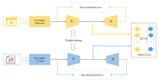 Overview of the proposed content common network. E denotes encoder structure, and D denotes decoder structure. The content common network consists of an encoder–decoder structure as a common representation space in which the weights of the network parameters of the encoder are shared. The content loss include reconstruction loss in the encoder–decoder structure and metric loss between the two modalities of information.