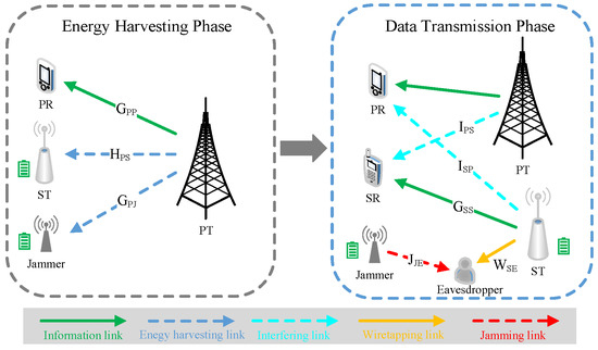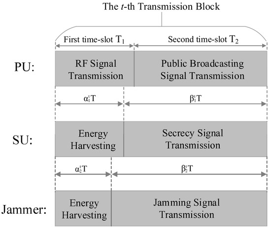 As shown in Figure 2, we consider a two-phase transmission scheme for both the ST and the jammer by dividing each transmission block into two time slots. In the first time slot , namely the EH phase, the PT broadcasts wireless RF energy signals to its receiver. In the meantime, the ST and the jammer harvest and store RF energy in their batteries, respectively. In the second time slot , namely the data transmission phase, the PU instantaneously updates its transmission power based on a power control strategy but is unknown to the SU [27], and transmits the public broadcasting signals to the PR, because the public broadcasting signal is meaningless to eavesdroppers, this paper only considers that the signal received by the eavesdroppers only includes the secrecy signal of SU. The ST transmits secrecy information to the SR while the eavesdropper begins to wiretap the secrecy information. To ensure secure communication, the jammer instantaneously sends jamming signals to intercept its wiretapping. The length of each transmission block is T and includes an EH duration and a data transmission duration. We denote and as portions of two time slots of the ST over a transmission block, , and for the jammer. Therefore, at the ST and the jammer, we have