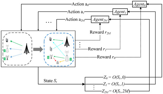 as joint interference powers, the joint SINRs, and the joint residual battery capacity, respectively. The instantaneous CSIs are included to reflect the current channel state. The joint interference power is related to agents’ transmission powers, which have a straight impact on the environment. For instance, the transmission power of the ST may cause strong interference to the main link, under which the SU may be inhibited from accessing the licensed spectrum to the PU and, thus, straightly leads to a temporary secrecy rate reduction. The joint SINRs at the previous transmission block represents the received QoS by the PR and the SR, and it facilitates the improvement of the power strategy of SU. As current battery capacity is related to the residual capacity , the transmission power at the ST will be influenced by . With further analysis of the state mechanism, the previous reward can be acted as feedback to activate agents, and, thus, the reward is included in the observation