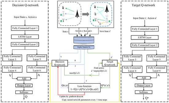 - To improve the classical DRL algorithm performance, we propose a new DRL network architecture, where the LSTM architecture is incorporated into the Dueling Double Deep Q-Network (D3QN) algorithm for overcoming the negative effects of the dynamic characteristics of the network caused by the time-varying channels and the random noise. Moreover, the construction of the loss function in the proposed method is different from the previously mentioned algorithms, and, thus, it can well avoid the overestimation of the state-action value and make the training process more stable.
