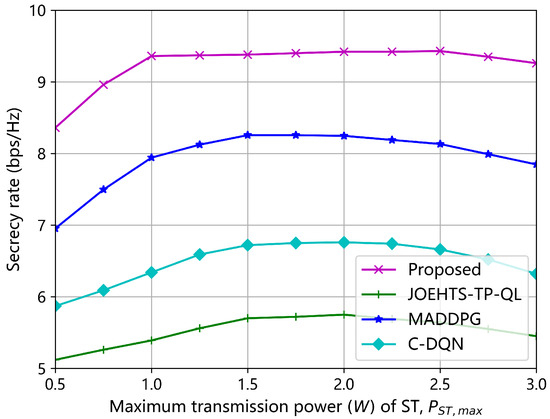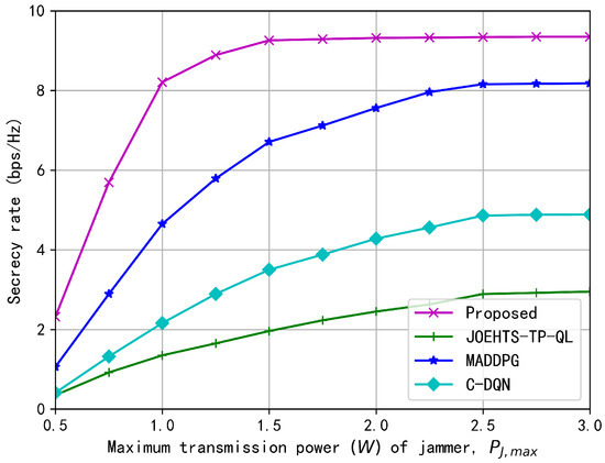 Figure 6 and Figure 7 show the secrecy rates with respect to increasing transmission powers of ST and jammer under different schemes, respectively. In Figure 6, the transmission power of the jammer is fixed as 2.0 W. The secrecy rate under our proposed method increases as the maximum transmission power of ST becomes greater, and the maximum secrecy rate is obtained when it is between 1.5 W and 2.5 W. Increasing the maximum transmission power contributes to a greater secrecy rate in some ways, but a greater transmission power is likely to cause strong interferences to the PU and, thus, jeopardize the spectrum access of the SU for gaining further performance enhancement. The C-DQN and the JOEHTS-TP-QL schemes have similarly low secrecy rates. In Figure 7, the maximum transmission power of ST is fixed as 2.0 W. It can be observed that when the maximum transmission power of the jammer is kept below a certain power level, the jamming signal of the jammer has little impact on the eavesdropper. This indicates that the jammer must harvest enough energy to increase the transmission power such that the secrecy performance can be improved further.