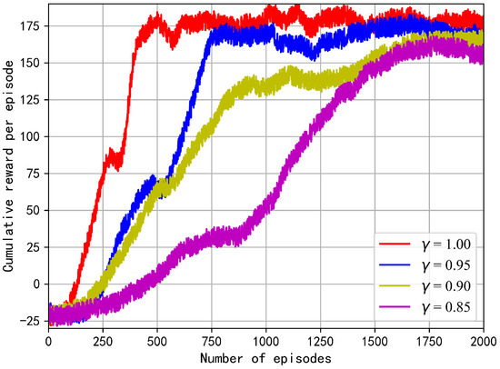 We study the effect of different discount rates on the cumulative reward per episode. In Figure 8, the more the discount rate deviates from 1.0, the more dramatically the trajectory of the reward fluctuates. When is set as 1.0, the reward converges in the fastest and most stable way. Theoretically, the agent is likely to focus on short-term returns when the discount rate is lower than 1.0. During the training process, the secrecy rate as a main part of the reward dominates the learning direction of the agent, hence maximizing the cumulative rewards encourages more instantaneous secrecy information to be delivered. However, agents cannot transmit secrecy data for long periods of time due to the limited energy. Therefore, acts as an optimal balance factor between the EH and WIT phases.