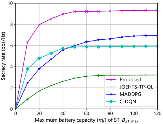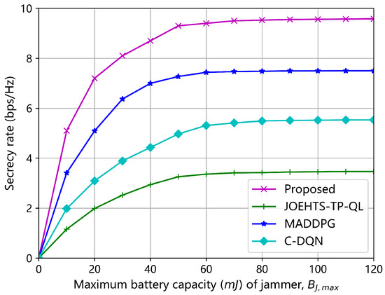 Figure 9 and Figure 10 show the secrecy rates under all the algorithms versus the maximum battery capacity of jammer and ST, respectively. With the increase in the maximum battery capacity, the secrecy rates under different schemes also increase. Of all the algorithms, the proposed algorithm gains the best performance at each given value of maximum battery capacity. When the maximum battery capacity is beyond 60 , all algorithms start to converge to different performance levels; this is mainly because the jammer and ST are influenced by the limited RF energy that can be harvested.