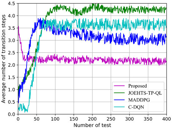 Figure 12 shows the average number of transition steps in each test. Multi-agents are tested in five hundred time steps at the end of each training episode. Our proposed scheme only requires the smallest number of transition steps to achieve the target state, while the other schemes need to take more transition steps. Moreover, when it is the 25th test, the proposed method fundamentally converges while other schemes at least need to take 65 tests and even more, and, thus, this makes the convergence speed of the proposed method 160% faster than the benchmark algorithm.