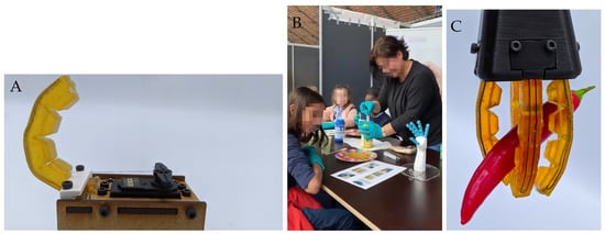 Result of the tutorial and workshop. (A): The self-healing soft finger with embedded sensor complete with the test set-up is the end goal of this tutorial. (B): The tutorial is easily adapted for use with commercial polymers, and can even be taught to children in an adapted version. No sensor was embedded in this case, and actuation was done manually. (C): The fingers made during the tutorial can for example be used in a gripper to pick up fruits.