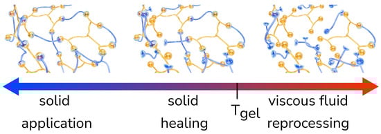 The materials can also be thermally reprocessed after having been cured, something that cannot be done with conventional (irreversibly cross-linked) thermosetting polymers. For the Diels-Alder networks, this can be done by heating the material above its Tgel, breaking bonds until the material starts to flow. At this point, the materials can be (re-)processed using approaches similar to thermoplastic materials. Techniques that have already been used include compression moulding, extrusion, fused filament fabrication (FFF), fused granulate fabrication (FGF), and selective laser sintering (SLS) [24]. But there is still an important difference: during this processing, a reaction is taking place, while this is not the case in thermoplastic polymers. Advantages of these self-healing polymers for additive manufacturing are that the final part is more isotropic, with strong covalent bonds connecting the different layers, easier to make airtight, and has smoother surfaces [24].