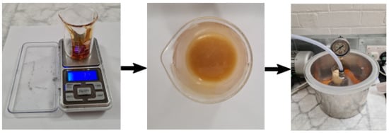 Synthesis of the self-healing polymer. First the correct amount of the different reagents (FT3000, BMI1400, 4TBC) has to be weighed (left). Afterwards, they need to be mixed well (centre). This creates trapped air bubbles, which are removed in a degassing step (right). A more detailed description of the synthesis can be found in the accompanying instruction document.