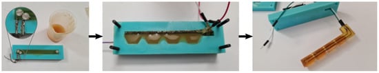 Once the sensor is positioned, the liquid matrix mixture for the finger is poured over the sensor (see Figure 5) and cured at room temperature or, preferably, in an oven, as described before. By curing at a raised temperature in an oven, the curing process is faster and some of the bonds in the sensor fibre are broken, ensuring the full interfacial strength is obtained faster during cooling. After filling the mould, a lid is placed on the mould to obtain a uniform thickness and reduce the capillary effect. An opening is present in the lid for the crimp connectors, through which some extra material can be poured if needed. While pouring, care has to be taken to avoid forming extra bubbles. To reduce any remaining bubbles, the mould can be placed in a pressure chamber. Under higher pressure, the bubbles will be squeezed and have less influence on the final result.