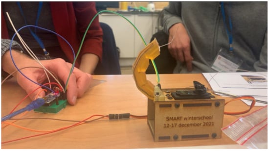 Participants testing the set-up. Participants successfully built the set-up and are actuating the finger while recording the strain sensor values on their computer.
