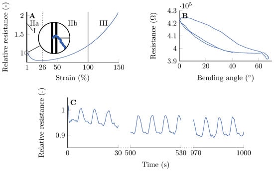 The finger with embedded sensor was subjected to a cyclic test (Figure 7B,C), during which it was repeatedly actuated up to its maximal bending angle. The maximal angle reached was 70, measured between the horizontal line and the line drawn from the base where it was clamped to the tip. When bending, the fibre is strained and the resistance decreases, corresponding to zone IIa. Some hysteresis and drift (3% after 1000 s) of the embedded sensor are noticeable, which are not uncommon for soft elastomeric sensors [18]. These properties make the reconstruction of the strain/bending from the resistance signal less straightforward, but can be solved using more extensive models or artificial intelligence [30].