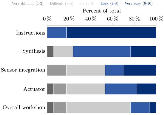 The participants were also asked to score the difficulty of the workshop and its parts: material synthesis, sensor integration, and the actuator. In addition, a score was given on the difficulty of the instructions given. The results of this difficulty analysis are shown in Figure 8. All participants found the instructions easy to follow, and the synthesis of the materials was also mostly perceived as not too difficult. This indicates that the goal of making the self-healing polymers easy to use has been reached. The overall workshop difficulty was rated as ‘ok’, which we believe is good as it is neither too hard, nor too difficult.