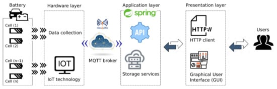 The presentation layer or front-end is the layer closest to the user. It offers the graphical interface with which the user interacts while using the upload and download management platform. It presents the views related to the consultation and creation of processes, configuration, real-time monitoring, etc. The graphical interface of the battery charge and discharge management platform presents a dashboard with a variety of panels that offer a variety of functionalities. These features include process creation, generation of a list of all processes, showing specific processes with graphics included, platform configuration, and real-time monitoring. The implementation of the graphical interface is carried out with Angular technology. This platform offers a versatile solution when it comes to adding cells and allows the parameterization of loading and unloading in this IoT solution. It must be taken into account that the periodic observations in each of the cells must be stored and, therefore, must be managed efficiently since they involve a large exchange of information in the communication channels, avoiding congestion.