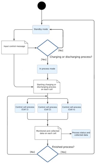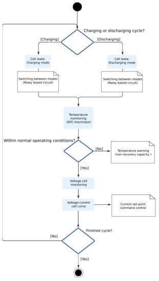 The developed software is in charge of carrying out the battery management processes. They are mainly based on managing a series of consecutive charging and discharging cycles in each individual cell, evaluating different parameters: voltage, intensity, and temperature; and monitoring the state of the process, the state of the cell, and the recovery capacity and performance of such cells. Each charge (or discharge) cycle is defined by a charge (or discharge) curve that defines the charge intensity according to the current cell voltage. This process provides a wide variety of charging and discharging schemes that are very useful for the study of the best charging or discharging curve with the aim of finding the optimal configuration that gives the greatest improvement performance for a specific cell. To stop charging and discharging cycles, there are some values that can be modified. In our particular case, as they are focused on NIMH cells with a nominal voltage of 7.2 V, it is established that the cell is fully charged when reaching 8.1 V [37] and fully discharged when reaching 3.2 V [38]. Safety parameters are also established, such as cell temperature. In this case, a maximum temperature of 42 °C was established; the process would stop if this temperature was reached. The flowcharts of cell and system control can be seen on Figure 4 and Figure 5, respectively.