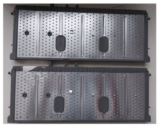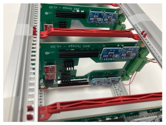 A preliminary prototype was developed with four integrated circuits to evaluate the operation of the proposed system in terms of the measurement of voltage, intensity, temperature, and energy parameters; as well as the capacity of the system to withstand the operating conditions during the necessary cycles. In addition, the proposed solution is able to automate both charging and discharging cycles. As can be seen in Figure 6, each designed system is capable of operating in an autonomous and automatic manner on two battery cells in a totally independent way. The solution can then operate on eight cells of a battery. As was discussed in Section 2, the selection of mounting two circuits in one board was based on economic criteria, when manufacturing integrated circuits. This system is fully scalable, with the aim of creating a system capable of governing the charge and discharge cycles of a battery containing any number of cells, operating on each cell independently in a subsequent phase, simply by adding integrated circuits. The circuits were mounted on a rack, as shown in Figure 7 and Figure 8. The Arduino board that governs the integrated circuits was mounted on the same rack. The performance tests were carried out on several cells of a Toyota Prius battery (Figure 9); these NiMH cells have a nominal voltage of 7.2 V and are internally made up of six 1.2 V batteries.