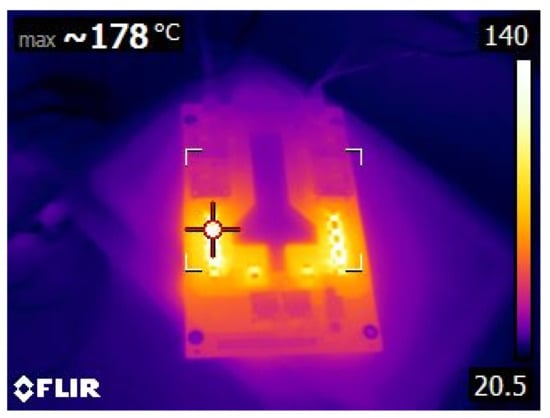 Firstly, the obtained results were for evaluating the system performance in terms of the functions entrusted to it: carrying out the programmed automatic charging and discharging cycles at a specific constant electric current. It was also verified that the system is capable of carrying out such charging and discharging cycles with different constant electric current values, based on the assigned voltage thresholds. Subsequently, the system can be programmed to carry out charge or discharge cycles at a certain constant intensity, and, upon reaching a certain voltage value, it automatically changes to another intensity to continue the charging or discharging process until reaching the next voltage threshold or the corresponding conditions to finish the test. Therefore, this system is capable of characterizing an individual cell with NIMH technology and detecting potential cell performance failures of such individual components from a global battery. Secondly, the results obtained were observed when the integrated circuits were operating under extreme conditions, aimed to determine their ability to work under such operating conditions. Accordingly, it was tested if they were able to carry out charges and discharges at an electric intensity of 1 A, measuring the temperatures reached on the plates by using thermography. Additionally, it was evaluated if the designed integrated circuits were able to take into account the heat sinks of the resistors and transistors. In Figure 12, the temperature reached before the installation of heat sinks on the plate can be seen in the thermograph. Other results were focused on the measurement curves of voltage, intensity, temperature, and energy during charging and discharging cycles at different values of electric intensity and with different voltage thresholds (Figure 13, Figure 14, Figure 15, Figure 16 and Figure 17).