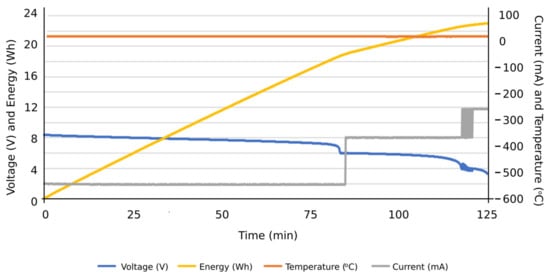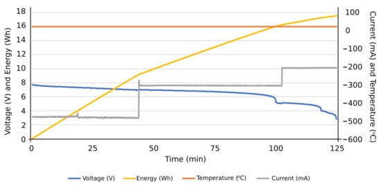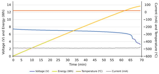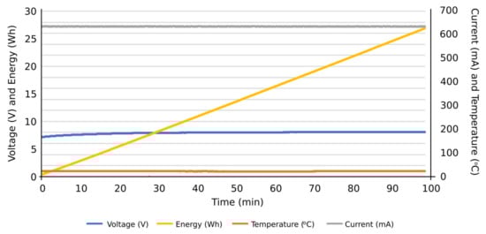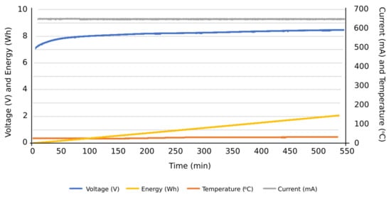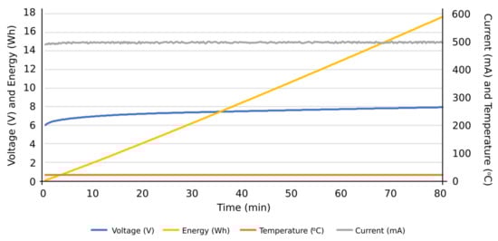 More specifically, and as can be seen in Figure 13, the discharge cycle of an individual cell was evaluated at a constant intensity of 500 mA. According to the results, the temperature during the discharging cycle was constant, deducing normal performance conditions of the cell. The energy discharged in this period is represented as well, reaching values close to 14 Wh at the end of the total discharge cycle. In Figure 14, the charge cycle of an individual cell is represented, at a constant electric intensity of 500 mA. The temperature during such charging period was constant, providing normal performance conditions of the cell. The energy used to charge the cell is also included as an additional result, reaching values close to 18 Wh at the end of the total charge cycle. Similar results can be found in Figure 15, in this case, with a constant electric intensity of 600 mA.