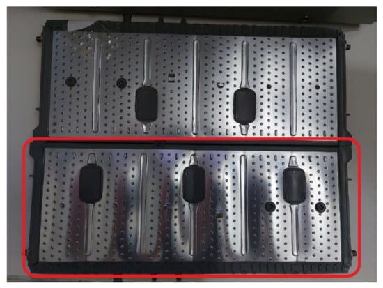 The tests consisted of programming consecutive charge and discharge cycles with different cells in the system, establishing various charge voltage limit values, and at different charge and discharge electric current values, monitoring the temperature of the cells of the battery and the corresponding charge and discharge curves obtained on each individual cell. It was also verified that the data provided to the system by the user in the interface were transmitted to the hardware, being possible to automate uploads and downloads. Figure 10 gives a general overview of the tested EV commercial battery and the proposed system prototype. In this case, a Toyota Prius Battery made up of a total of 28 cells was selected. The shape of each of these cells and the prototype connections can be seen in Figure 11. Each pair of battery cells is governed by one of the integrated circuits shown in Figure 6 and previously described.