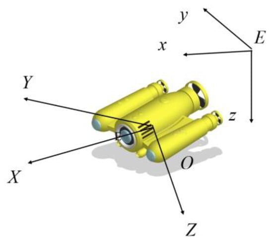 The origin of the ROV body reference system is O, which is at the geometric center, the X axis is the same direction as the positive symmetry axis of the underwater vehicle body structure, the Y axis is parallel to the baseline of the underwater vehicle body structure and perpendicular to the X axis, and Z is perpendicular to the plane, as shown in Figure 1.