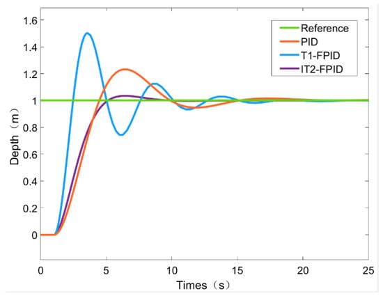 To illustrate the performance of each controller, Figure 8 shows the depth control performed by the ROV using an IT2FPID and two different controller types. For example, Figure 8 shows the performance of the fuzzy behavior for depth control based on an IT2FPD controller and a T1FPID controller, respectively. From the figure, it can be seen that the time required to reach a stable state is different. This is a natural response due to the different performances of each controller. As pointed out in reference [44], the inclusion of higher order fuzzy controllers not only allows for more degrees of freedom in the fuzzy sets, but also improves system stability by including better handling uncertainty. Recent advances in the development of higher order fuzzy logic controllers, such as general type-2 fuzzy controllers (GT2 FLCs) [45] and interval type-3 fuzzy control controllers (IT3 FLCs), have been shown to outperform conventional fuzzy controllers by better handling dynamic disturbances and actuator nonlinearities [46]. Because the upper and lower parts of the FOU of IT3 FLCs are not constant, and the secondary MF is interval type 2. In GT2 and IT2 FLCs, T1 provides fuzzy sets and crisp numbers, respectively.
