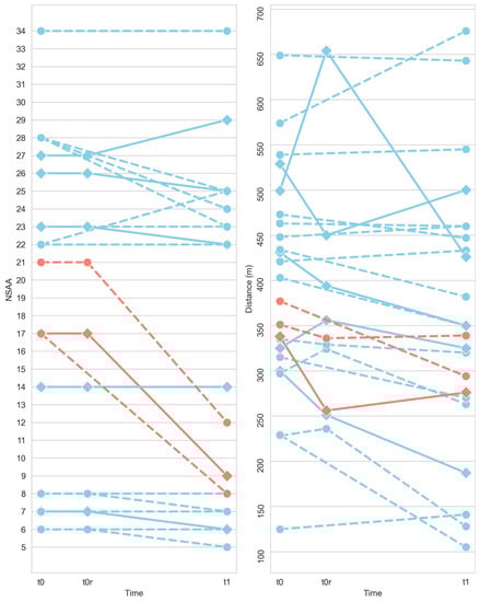 NSAA (left) and 6MWD (right) individual evolution for DMD (pathological) subjects between initial session (t0), the retest session (t0r), and the final session (6 months later, t1). Subjects colored in pink showed an abrupt decline in NSAA score between t0 and t1. Subjects with a solid line achieved a difference in distance between t0 and t0r greater than 30 m.