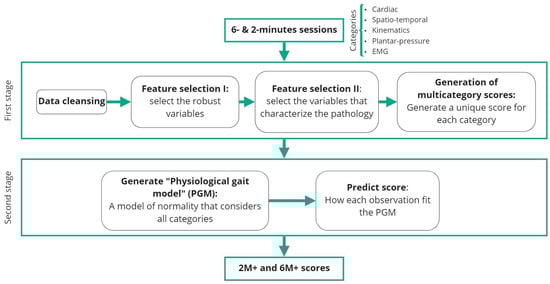 Figure 3 shows the pipeline with respect to obtaining a multidimensional score considering the information from the five categories. The pipeline is divided into one pre-processing stage and two processing stages. In the first processing stage, a unified score was generated, which was computed from the specific variables selected to characterize the pathology. This process of feature selection accounted for data points from each of the five categories. During the second stage, a “physiological gait model” (PGM) composed of the five categories was obtained to subsequently evaluate the scores for pathological subjects by analyzing the distance from subject to the PGM in the feature-space. This entire process was calculated for both 6 and 2 min, yielding scores of 6M+ and 2M+, respectively.