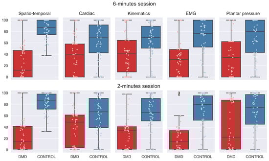 The measurements of the five categories were assessed for 2 and 6 min intervals, thereby obtaining a score for each category and for each period. The categorical scores represent deviations of the pathological subjects in the five domains compared to a normal gait. For each category, a score of 100 indicates that the domain is not affected, that is, the subject behaves like the control population. Figure 4 shows the distribution of the scores for each of the categorized variables for both groups.